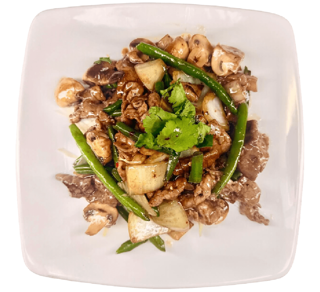 Thin slices of beef wok-fried with mushroom, green bean and onion in a soy, brown sugar, garlic and ginger sauce
