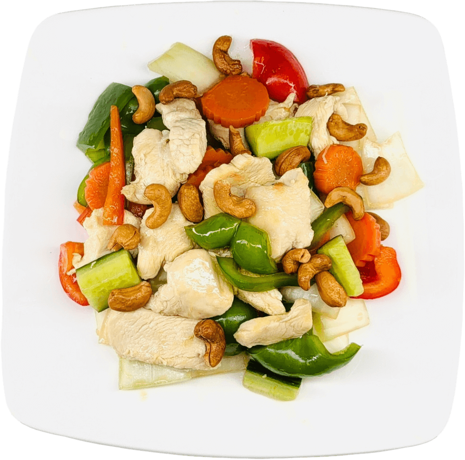 Sliced chicken breast, infused in Asian five spices, wok-fried with zucchini, carrot, bell pepper, onion and cashew nuts