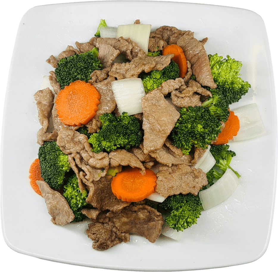 Classic Chinese stir-fry with sliced beef, fresh broccoli, carrot and onion in a rich brown sauce