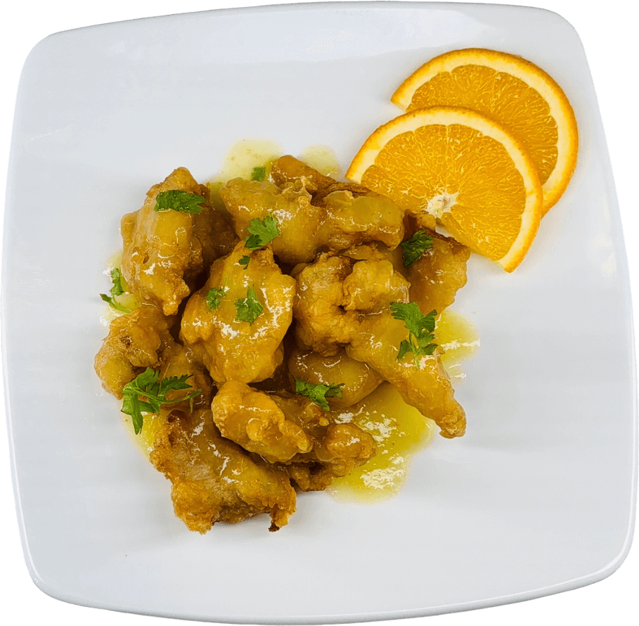 Crispy fried chicken coated in a sweet, tangy orange glaze